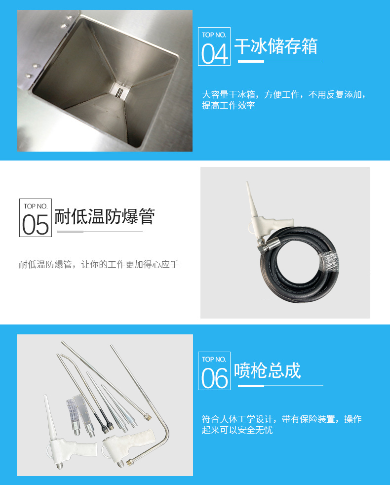干冰清洗降低了清洗的人工成本、生产设备的停机时间和废物处理成本,从而减少了清洗的诸多负面影响;并且不需要干燥和冷却时间,降低了很多不必要的成本。